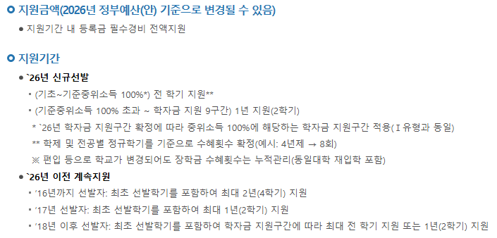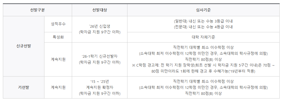 | 신규 선발 | 2026학년도 신입생 | 학자금 지원 9구간 이하, 내신 또는 수능 3등급(일반대), 4등급(전문대) 이내 |